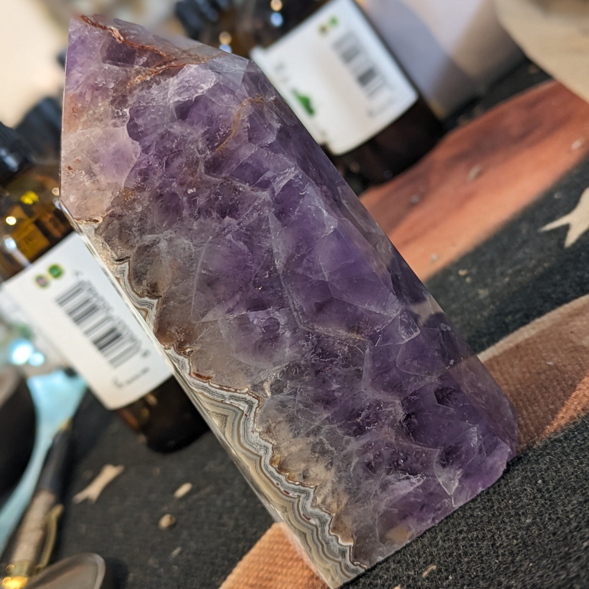 This stunning combination has occurred when Amethyst and Crazy Lace Agate have formed alongside each other in matrix. This chunky tower measures 10.5cm tall and weighs 388g.