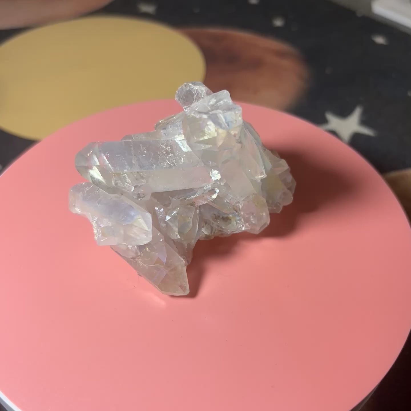 This stunning Clear Quartz cluster has formed naturally and then been given an Angel Aura treatment - wrapped in a thin layer of fine vaporised metal at high temperature. A completely unique piece, shimmering with all the colours of the rainbow, it measures approximately 8cm at its widest point and features at over 30 points.
