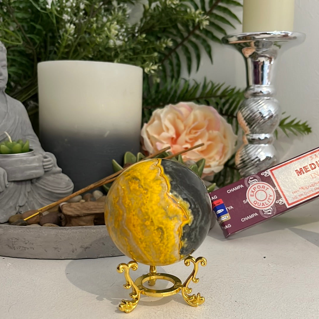 This beautiful Bumblebee Jasper Sphere is sure to bring joy and delight! It has a diameter of 6.5cm.